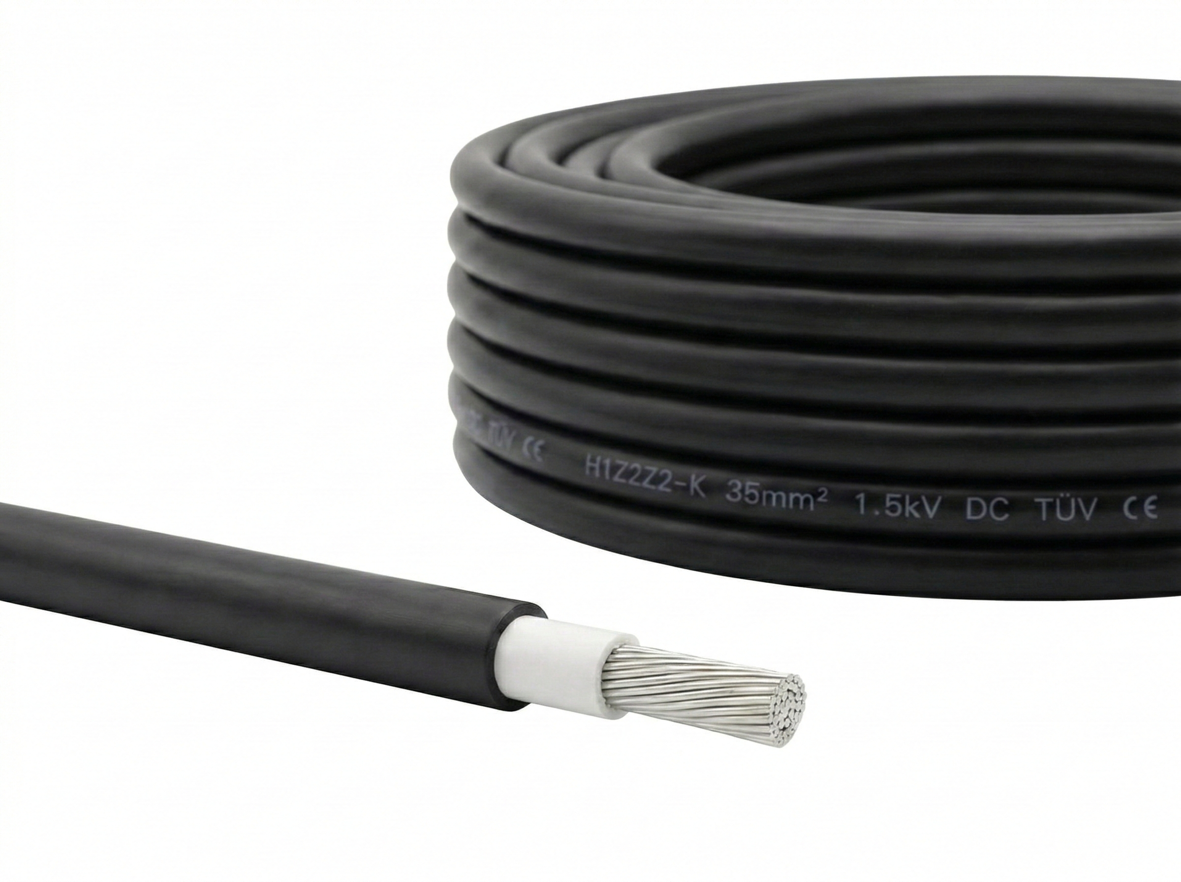 Cable de potencia profesional H1Z2Z2-K de 35mm² en color negro. Diseñado específicamente para instalaciones solares fotovoltaicas y bancos de baterías de alta capacidad. Su doble aislamiento y conductor de cobre estañado garantizan una mínima pérdida de energía y máxima resistencia a la corrosión y rayos UV.