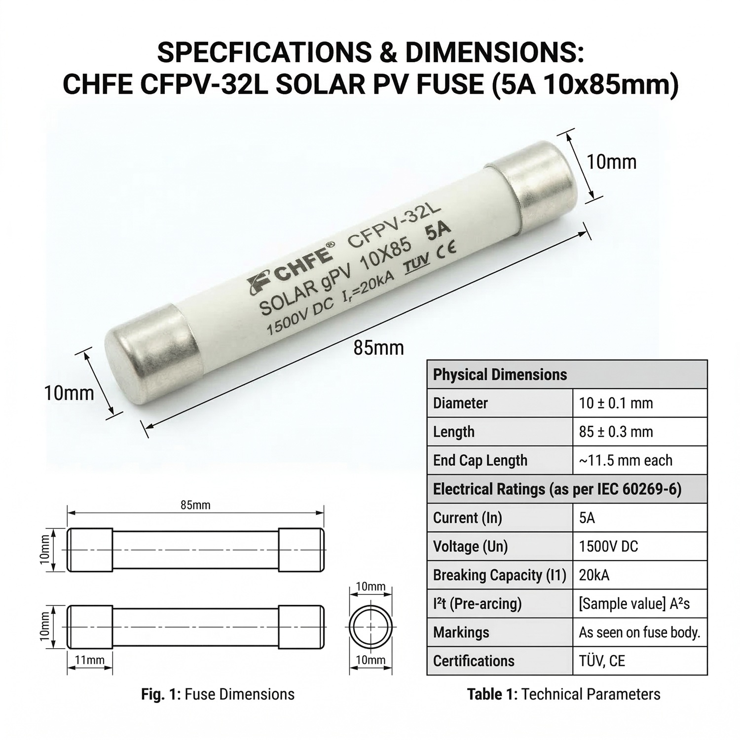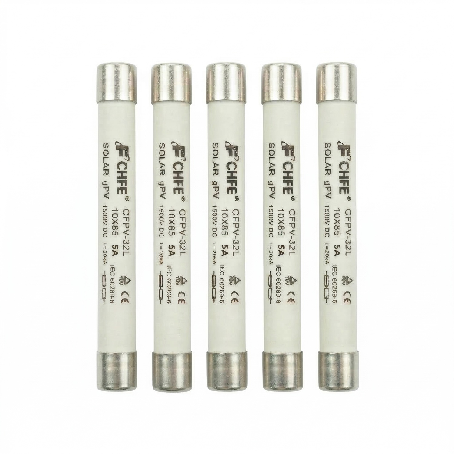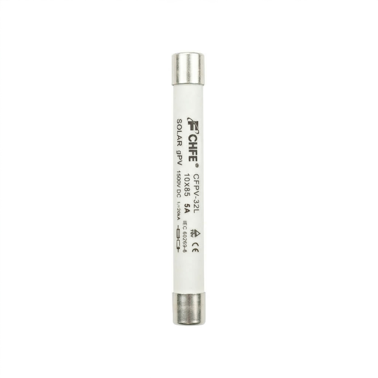 Fusible cilíndrico de formato 10×85 mm marca CHFE, diseñado específicamente para instalaciones solares fotovoltaicas de alta exigencia (Clase gPV). Soporta un voltaje máximo de 1500V DC y una corriente de 5A, con una excelente capacidad de ruptura de 20kA. Cuenta con certificaciones internacionales TÜV y CE (Norma IEC 60269-6).