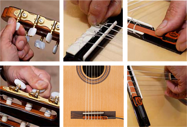 El NG-7S se instala de forma muy fácil y segura en el puente de la guitarra clásica o flamenca, bajo las cuerdas, utilizando la tensión de las mismas. No requiere hacer perforaciones, cortes ni daño a tu guitarra.