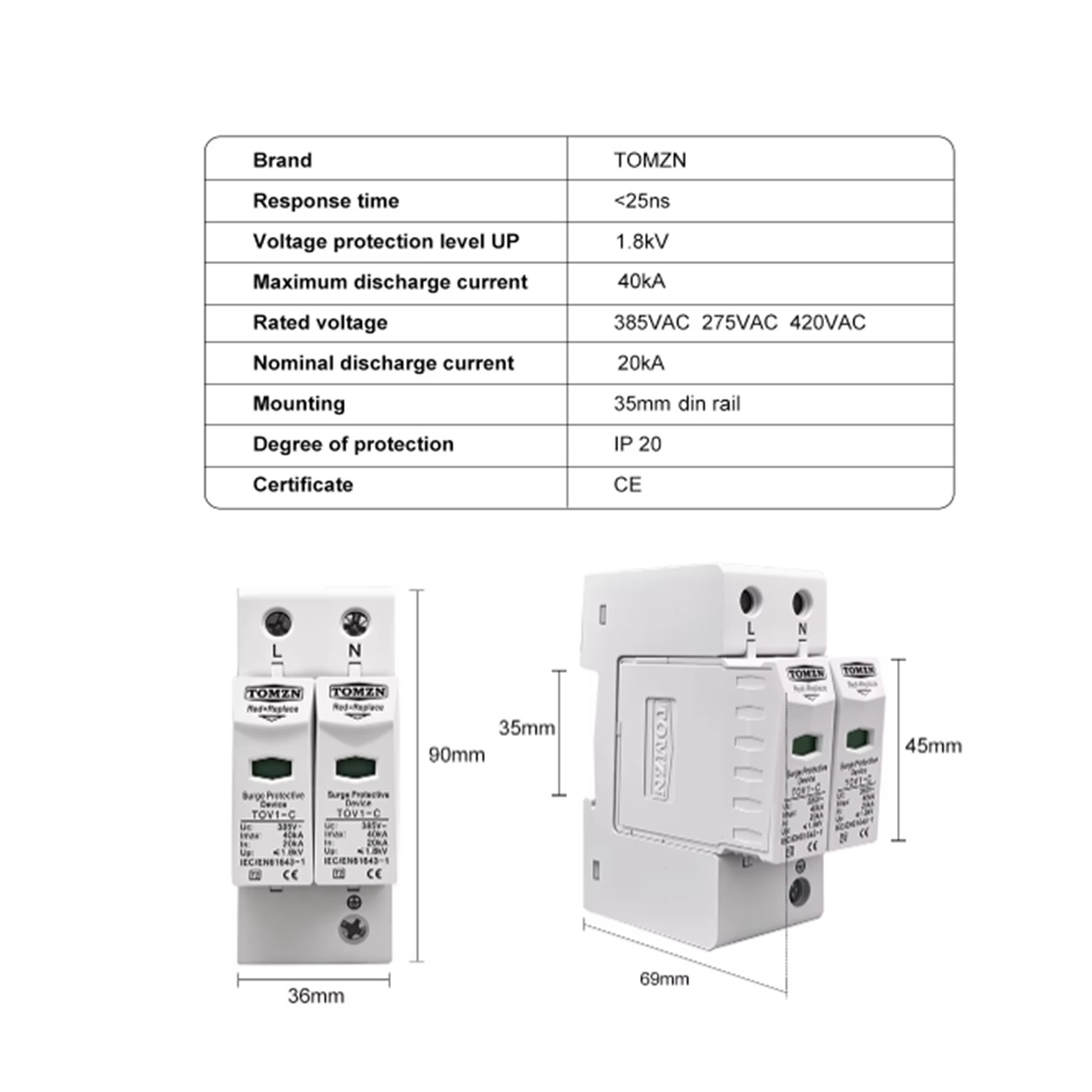 Protector de sobretensión (SPD) de 2 polos para corriente alterna (AC) marca TOMZN. Ideal para resguardar la red eléctrica de hogares, comercios y la salida AC de inversores solares contra picos de voltaje y descargas atmosféricas. Cuenta con una capacidad de descarga máxima de 40kA y un práctico indicador visual de estado.